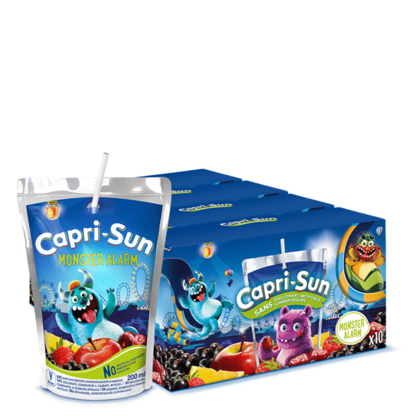 Savourez la douceur exotique de Capri-Sun Monster Alarm ! Ce pack de 40 poches de 200ml offre une boisson rafraîchissante associant le mélange fruité de pomme, cassis et griotte.
