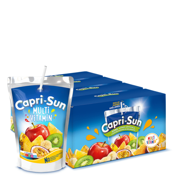 Savourez la douceur exotique de Capri-Sun Multivitamin ! Ce pack de 40 poches de 200ml offre une boisson rafraîchissante réunissant le goût de l’orange, du citron, de la pomme et d’autres fruits.