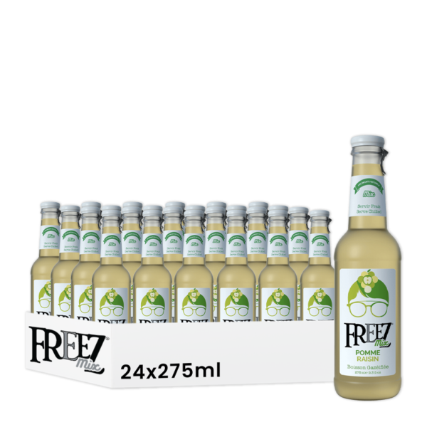 Freez Pomme Raisin, une boisson gazeuse pétillante au délicieux mélange de pomme et raisin, pour une touche fruitée et rafraîchissante. Disponible en pack de 24 bouteilles en verre de 275ml.