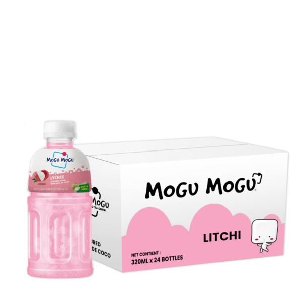 Mogu Mogu Litchi en pack de 24 bouteilles de 32cl, une boisson exotique et rafraîchissante au goût sucré de Litchi, avec des morceaux de nata de coco pour une texture unique.