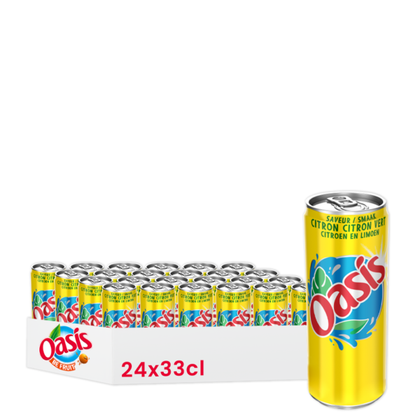 Oasis Citron Citron Vert, une boisson fruitée et rafraîchissante au goût de citron et citron vert. Disponible en pack de 24 canettes de 33cl.