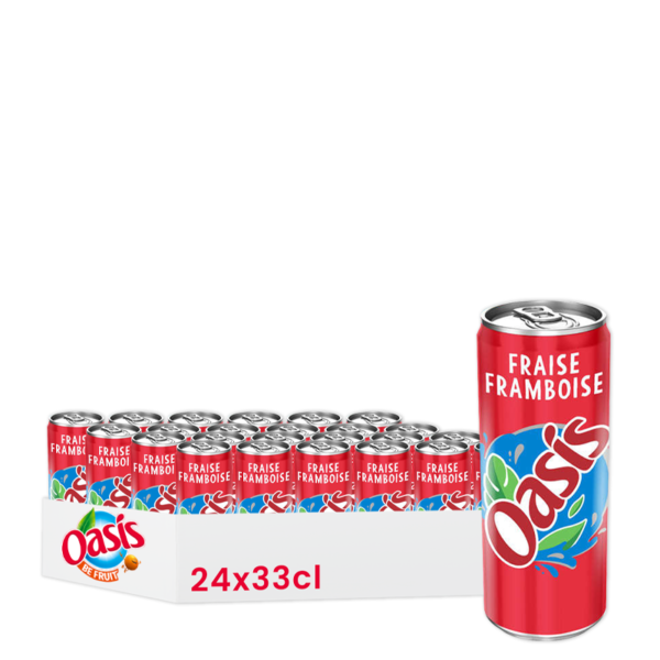 Oasis Fraise Framboise, une boisson fruitée et rafraîchissante au goût fraise framboise. Disponible en pack de 24 canettes de 33cl.